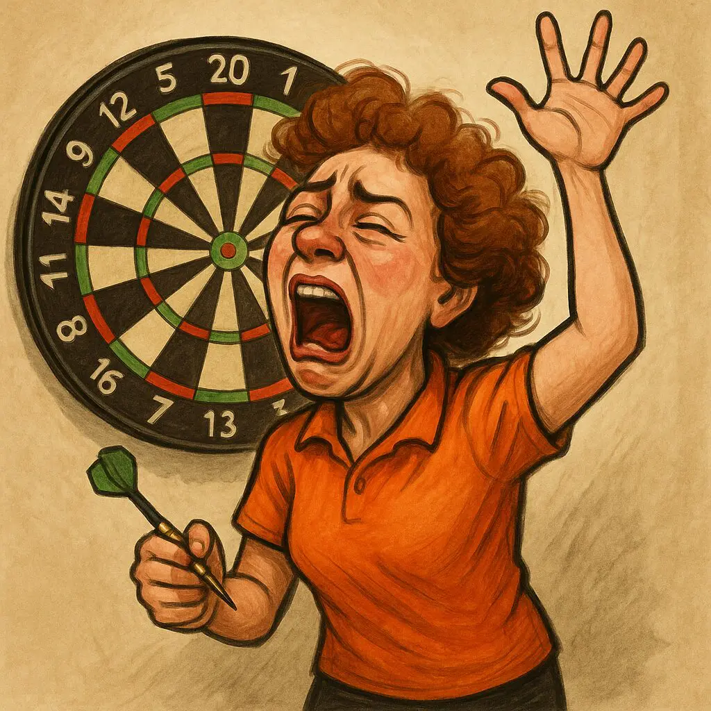 Hun behøver ikke et publikum – men hun elsker et. Og hvis der ikke lige er nogen, der kigger, skal hun nok sørge for, at de vender hovedet. En triple 20 ledsages altid af et råb, der kan vække hele klubben: “JAAA! SÅDAN!!” Og hvis hun brænder en double, følger det med en opvisning af verdensklasse: et kast med armene i vejret, et dybt suk, et himmelvendt blik og en dramatisk erklæring som: “Hvorfor sker det altid for mig!?”